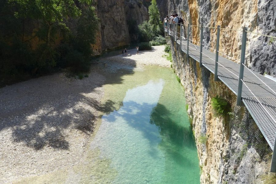 Uno de los planes más famosos en Alquézar es la ruta de las pasarelas del río Vero. Se trata de un recorrido fácil y muy visual que sigue el cauce del río a través de pasarelas metálicas colgadas de la roca. Durante el camino disfrutarás de pozas cristalinas, cañones y un paisaje de gran belleza natural.